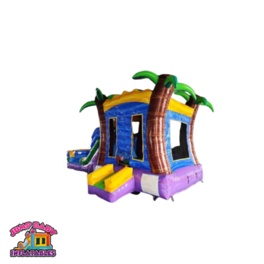 Take a look at the awesome Goombay Palms combo! This combo features a large bounce area, two basketball hoops, a climbing wall and a slide into an inflatable landing pad. Whenever you are looking for a bounce house in Denham Springs, Walker, or Watson look no further than Jump Baby Inflatables.