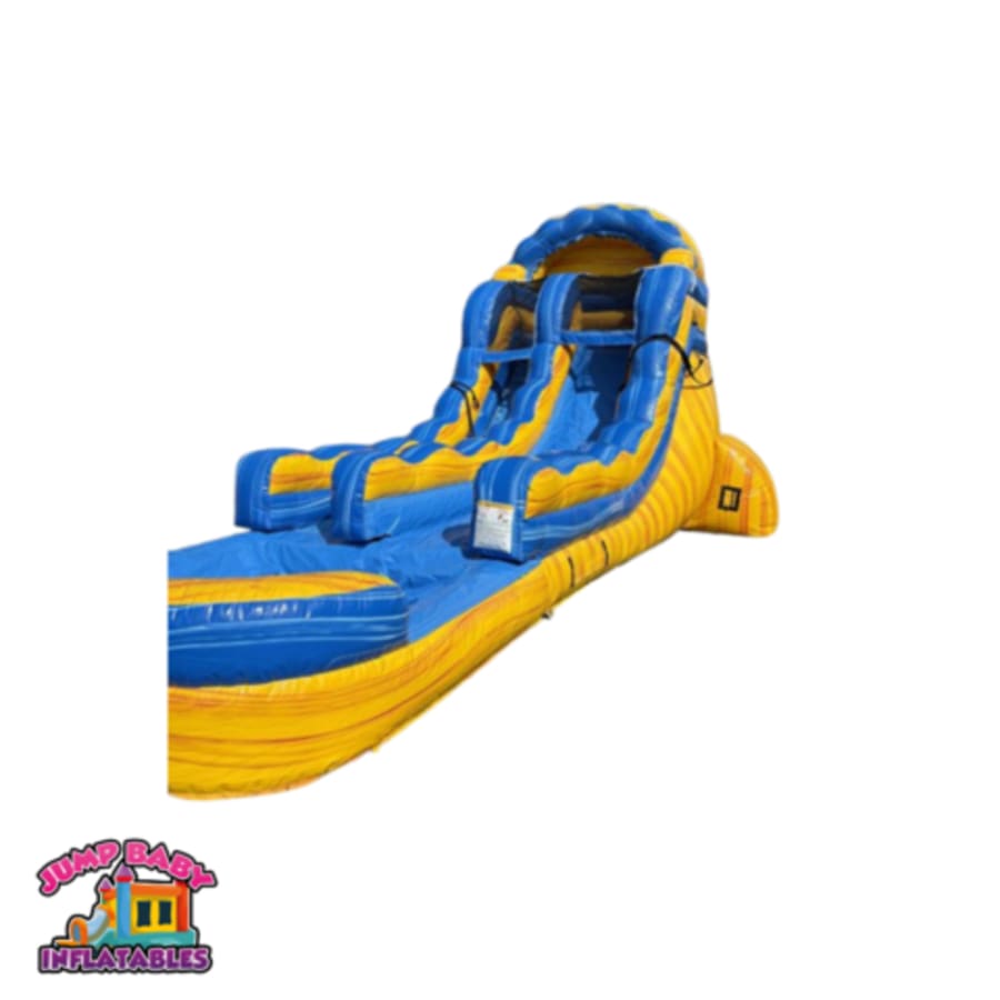 Looking to add a splash of excitement to your next event? The 16' Lava Falls waterslide is the perfect centerpiece for any occasion. With its striking yellow and blue design, this towering 16-foot tall slide is not only visually appealing but also guarantees hours of fun for both kids and adults alike.