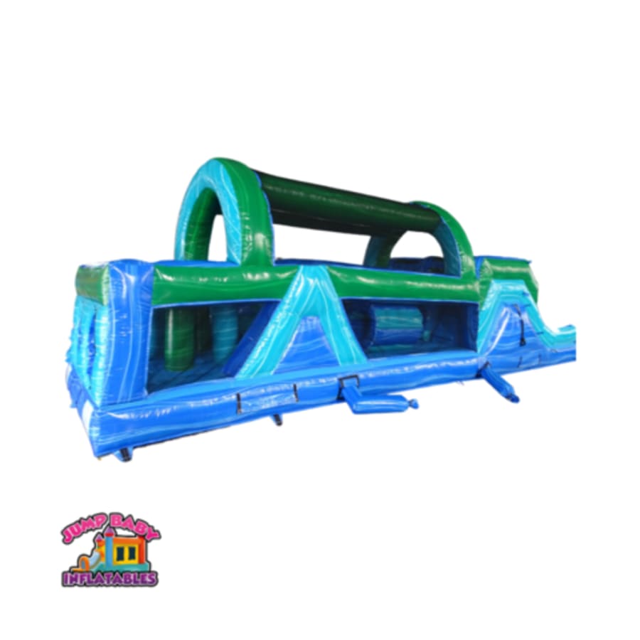 This obstacle course for rent in Denham Springs features a marble teal, blue, and green color scheme. This obstacle includes pop-ups, tunnels, and a dual lane slide. The kids and party guests will have a blast playing on this obstacle course inflatable for rent.
