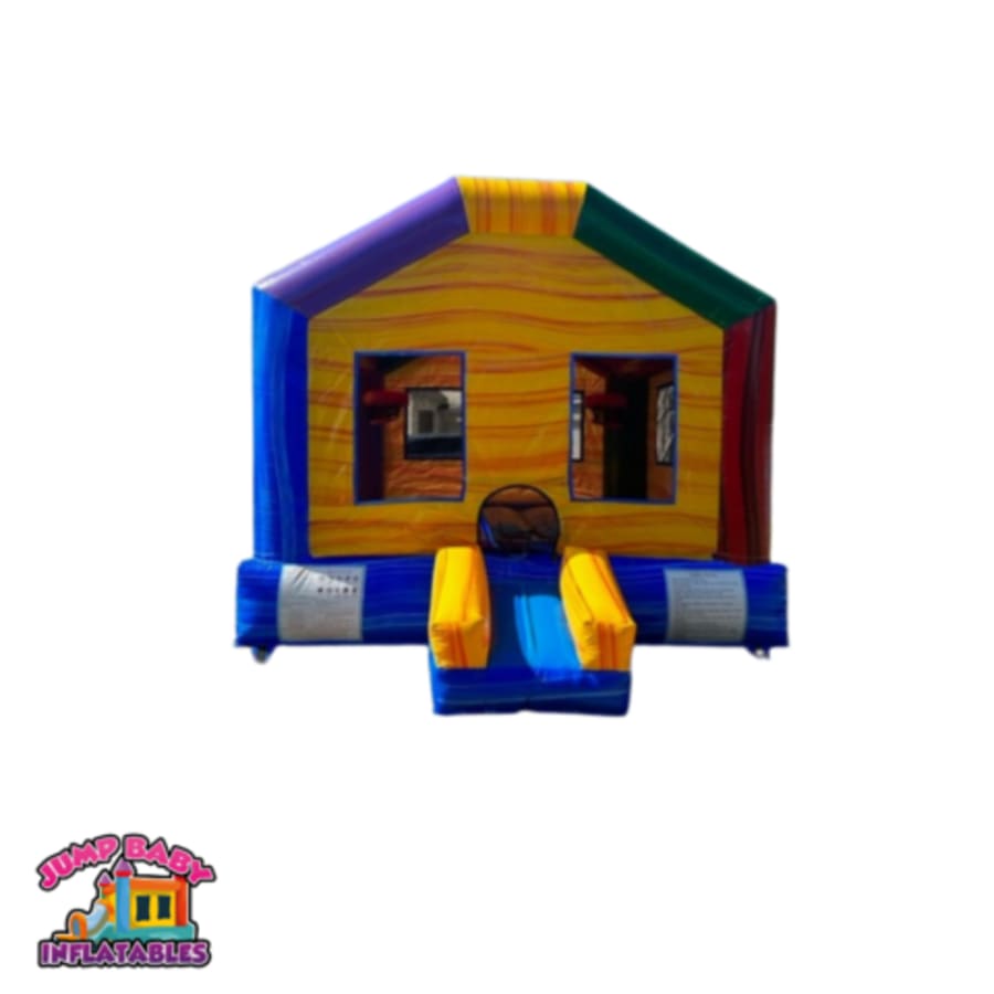 The marble fun house features a large jumping area and two basketball hoops for hours of fun!
