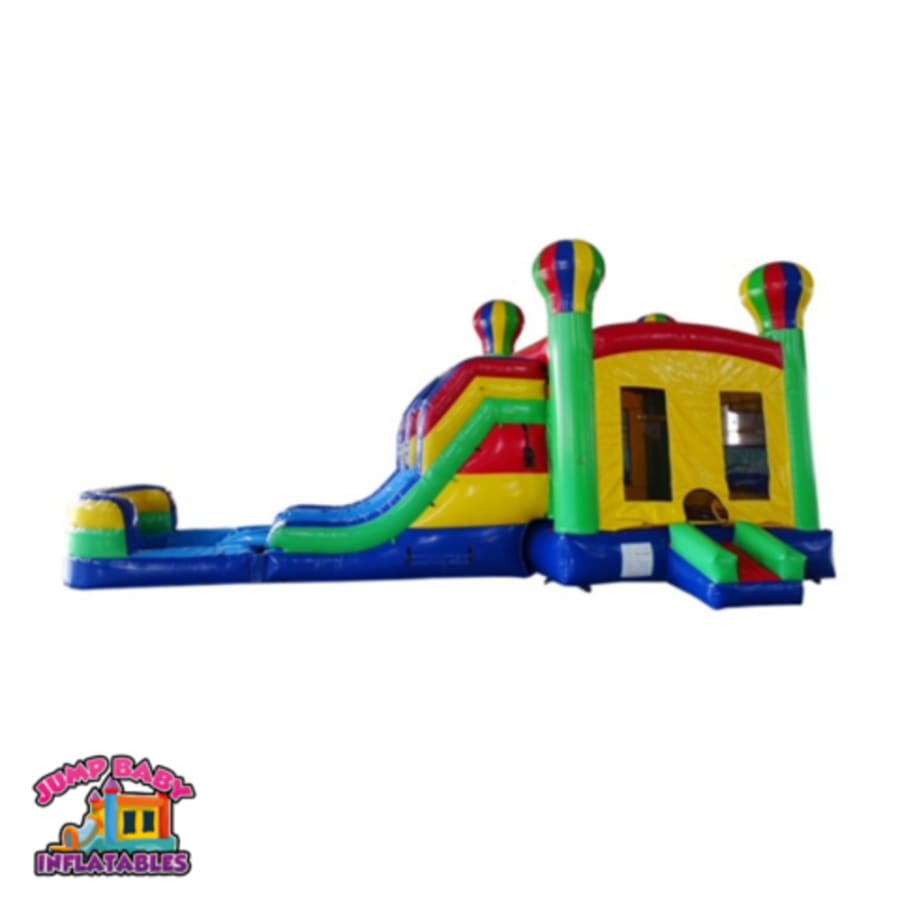 A classic design for a bounce house with the advantage of a dual lane slide! This 7 in 1 combo has it all. It features two basketball hoops, a double lane climbing wall, and a dual lane slide.
