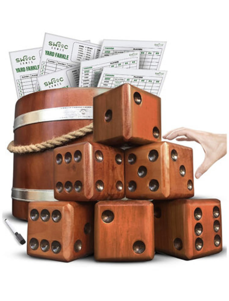 A giant take on a classic game. Yardzee is over sized and suitable for outdoor play. Your rental will include dry erase score sheets so you can keep track of who has the most skill at rolling these giant wooden dice.