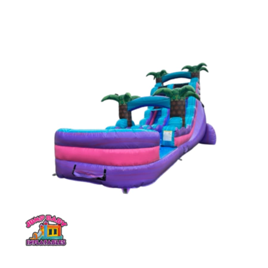 Check out this 18 foot beauty. Lots of pink, teal, and purples on this water slide for rent in Denham Springs.